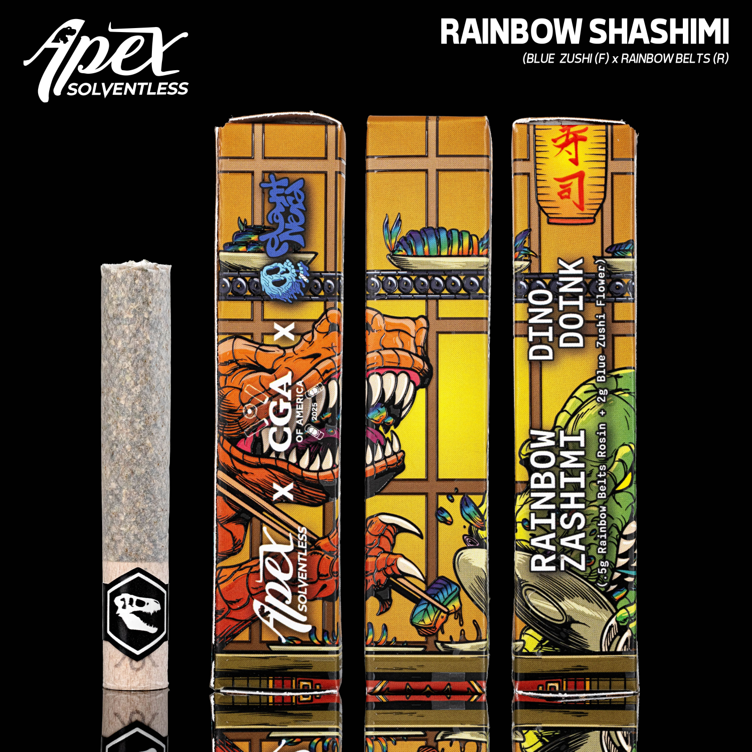 The Apex Solventless Dino Doink 2.5g is a premium, infused pre-rolled cannabis joint (also known as a "hash hole") made with 100% solventless rosin and available in various strains.