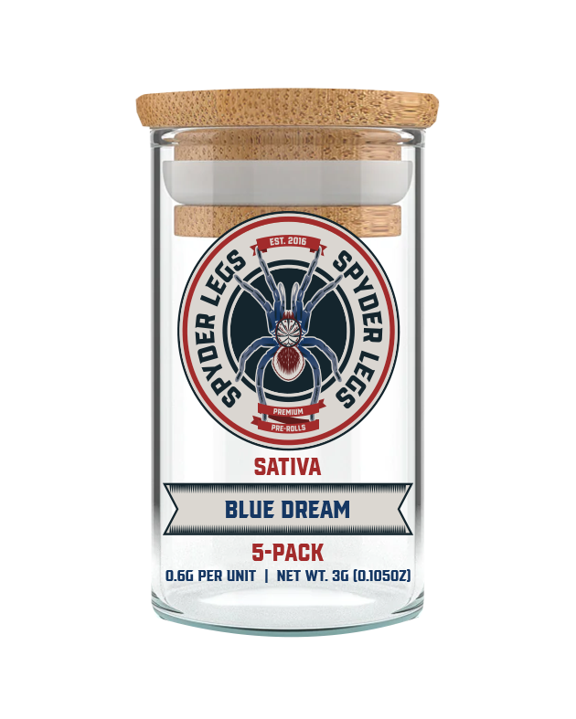 Blue Dream’s sweet berry flavor and smooth effects spark creativity and deliver calm, balanced energy. Infused with live resin and dusted in kief, the Spyder Legs 5-pack of 0.6g pre-rolls provides a clear, refreshing experience.